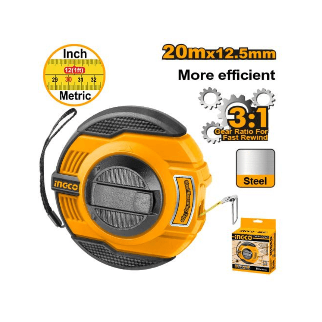Rapport de vitesse 3:1 pour un rembobinage rapide Longueur et largeur : 20 mx 12,5 mm Avec mesures métriques et pouces Engrenage rétractable en matériau pur Avec revêtement entièrement en caoutchouc Poignée intégrée idéale pour une utilisation et un rangement pratique Emballé dans une boîte de couleur